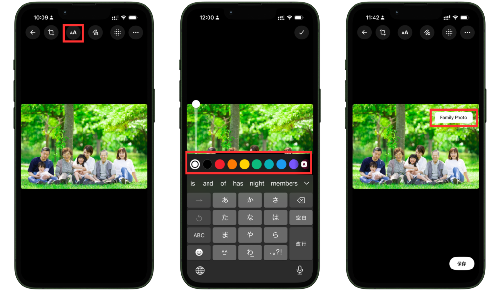 テキスト機能では、画像の上に短い説明やラベルを置くことができます。編集画面でテキスト機能を選び、文字の色を選んだ後、入力した文字を好きな位置に置いて保存します。説明画像や案内画像では補足を入れるだけで分かりやすさが大きく変わるため、実用性の高い機能です。
