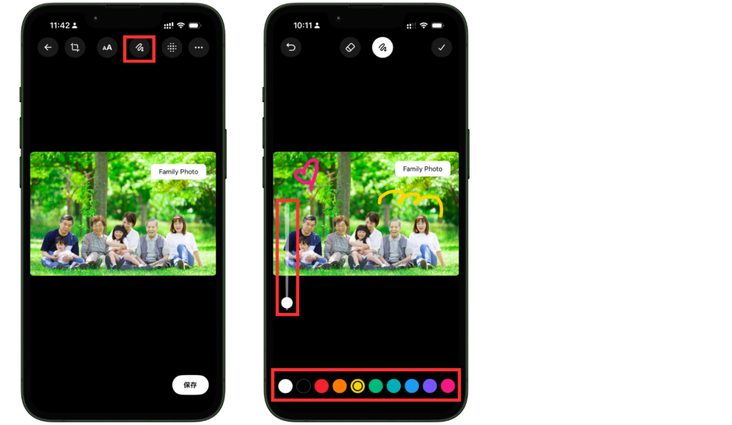 手書き機能では、写真の上に線やマークを書き加えることができます。編集画面で手書き機能のアイコンを選択し、必要に応じて筆の色や太さを調整しながら描きます。絵を描きたいときだけでなく、スクリーンショット解説や補足入りの画像を作りたいときには、とても相性のよい機能といえるでしょう。
