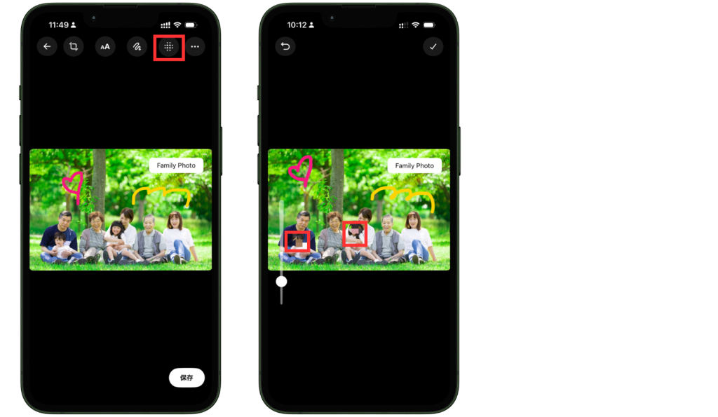 写真エディターでは、見せたくない部分を隠すための加工にも対応しています。編集画面からモザイク機能を選び、隠したい箇所の上をなぞるようにしてモザイクをかけます。プライバシー保護の観点から、顔や個人情報をそのまま出したくない場面で重宝しそうです。