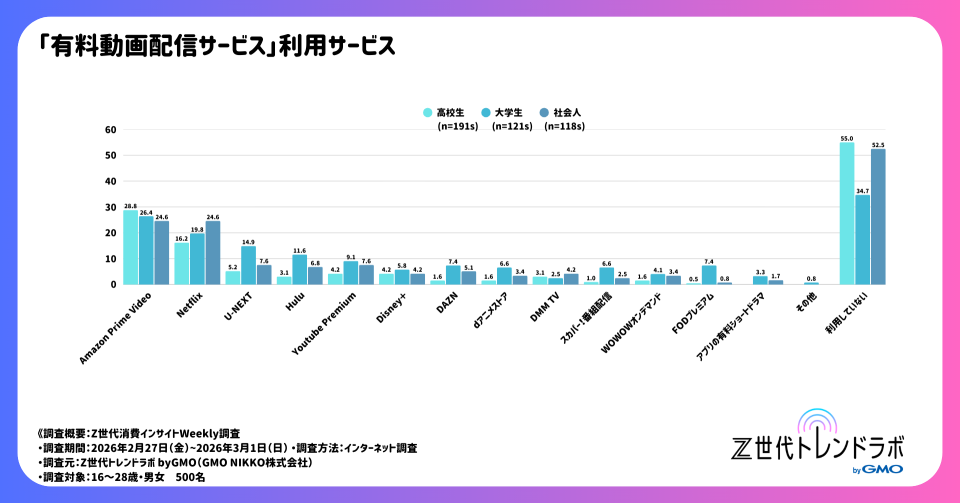 ・Amazon Prime Video:高校生28.8% → 大学生26.4% → 社会人24.6%(若いほど高め)