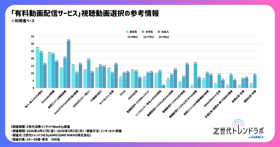 視聴する作品を選ぶとき、学生2層は「人からのおすすめ」が強く、社会人は「検索」が強い。ここが今回、いちばん層差が出たポイントです。
