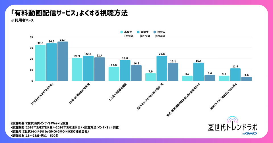 そのうえで、タイパ(時間効率)意識が垣間見える行動(スキップ・倍速・つまみ食い・全話を見ない抜き出し見)は、特に大学生で強めに出ており、「話題の山場だけ押さえる」「途中で離脱してもOK」という、コンテンツ消費の“編集権”を自分側に持つ観方が一段強い印象です。