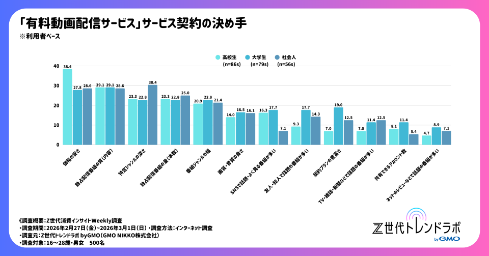 契約の決め手は、3層とも大枠は同じで、まずは価格と独占配信コンテンツ。