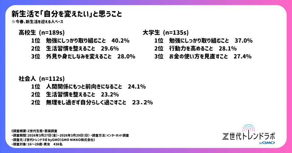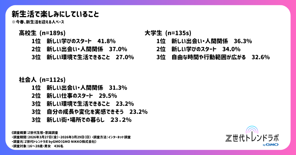 桜が咲き誇る春は、多くの若者にとって新しいステージへの幕開けの季節。高校生・大学生・社会人という、それぞれ異なるライフステージを迎えたZ世代たちは、この春をどんな気持ちで迎えているのでしょうか? 楽しみにしていること、不安に感じること、そして自分を変えようとする意志まで、3層の"リアルな声"を読み解いていきます。