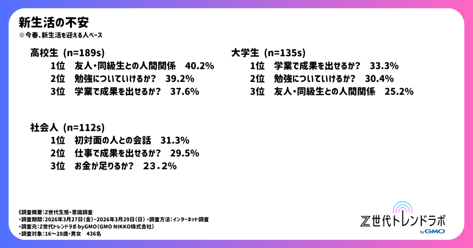 「新しい出会い・人間関係」「新しい学び・仕事」への期待は、高校生・大学生・社会人の全層で上位にランクイン。ライフステージが違っても、新しい環境で人とつながり、何かを学びたいというポジティブな気持ちはZ世代に共通していることがわかります。