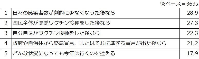 上位項目をみると、「感染者数が劇的に少なくなったら」「国民全員がワクチン接種をした後なら」と、まだまだ旅行に対して慎重な意識を持っていることがわかります。